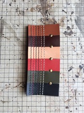 写真のレザーカラーは上からブラウン、ダークブラウン、ヌメ、レッド、モスグリーン、ブラックです。金具は真鍮、糸はポリエステルのベージュです。